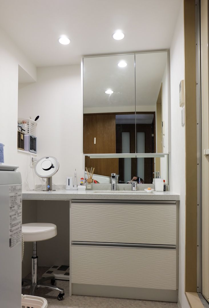 洗面台の配置を変えた洗面室は、入り口正面に鏡を持ってくることで奥行きを感じられるようになり、動線がスムーズになったことでスペースを無駄なく使うことが可能に。洗面台の前にキャスター付きの丸椅子が置けるようになり、座ったまま顔を洗い、そのまま鏡前に移動してドライヤーを使ったりメイクをしたりと、長時間いても足が疲れることもなく快適な洗面室が誕生しました。丸椅子を使わないときは、カウンター下にすっきりと収納できます。