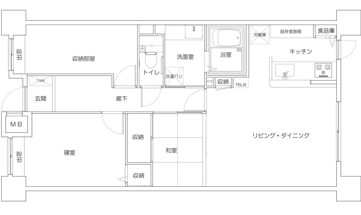 また、キッチンカウンターの吊戸棚を撤去することにより、広く見渡せる空間を確保。
