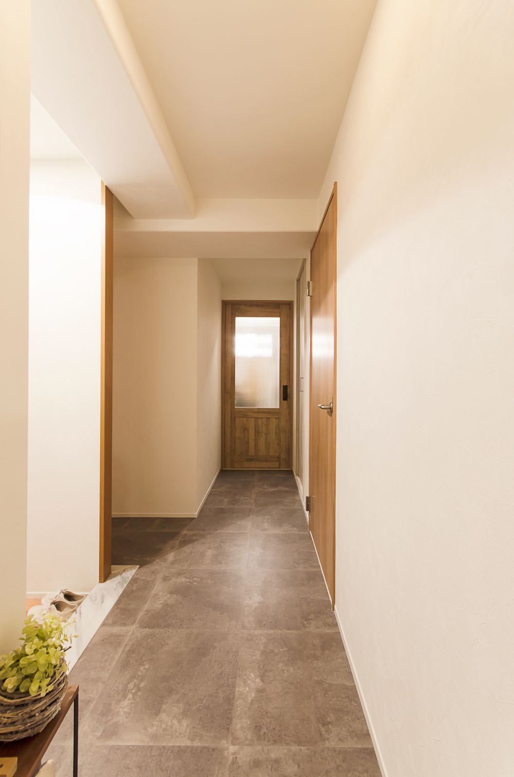 今回洋室2部屋には「後に子ども部屋にするから明るくシンプルにしたい」との思いから、柔らかい印象のフローリング調のフロアタイルを採用しました。一方、それ以外の空間はモルタルのような質感のストーンタイル風の床材を選択。