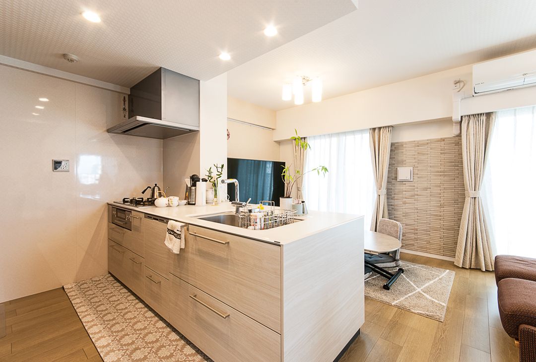 キッチンも洋室同様、リビングと一体の空間にしてより広がりを感じられるよう、壁を取り払いペニンシュラ型のキッチンに。