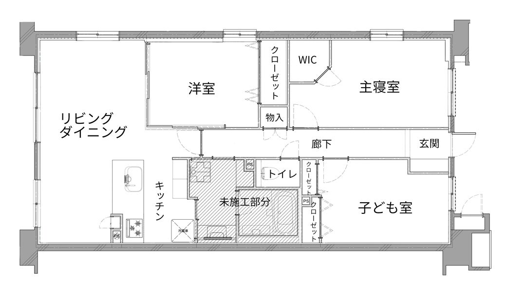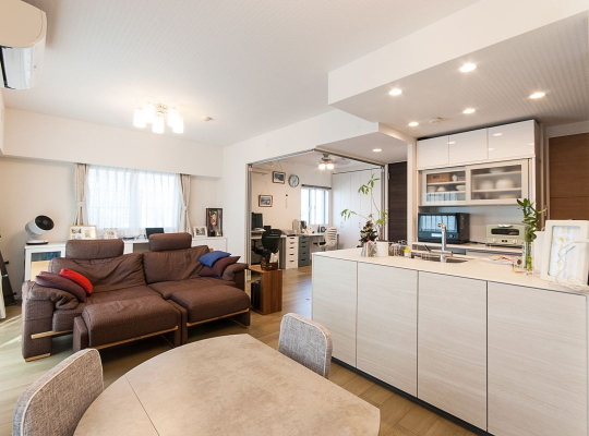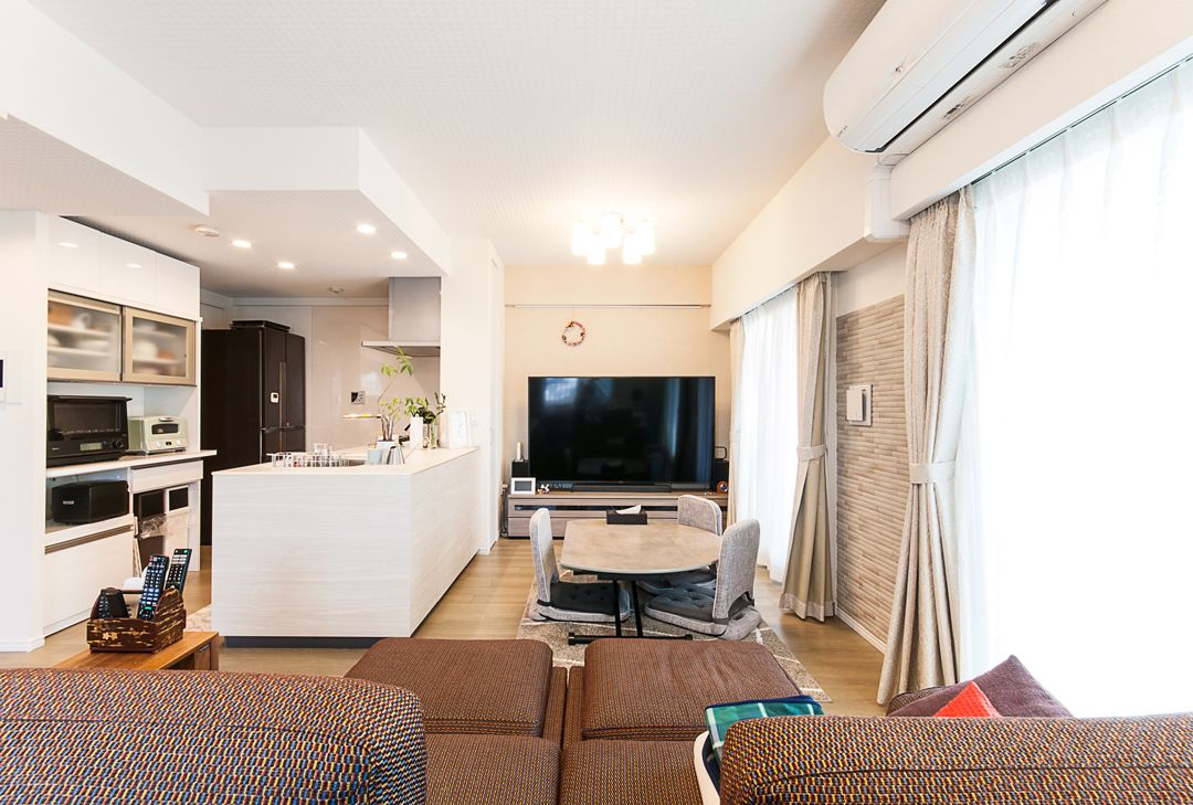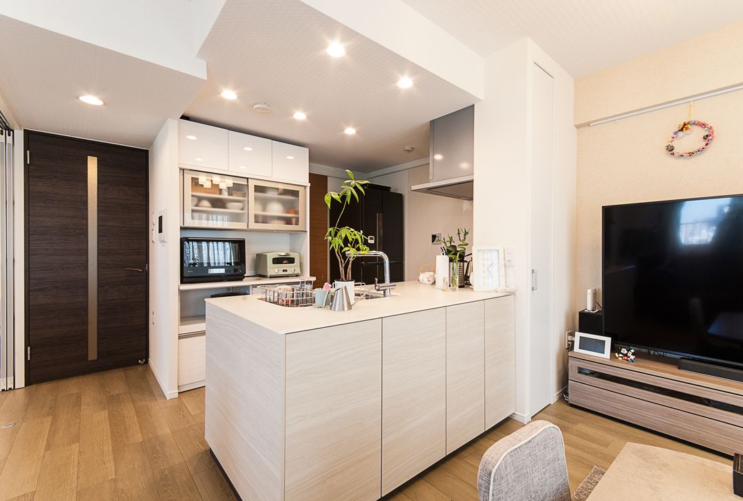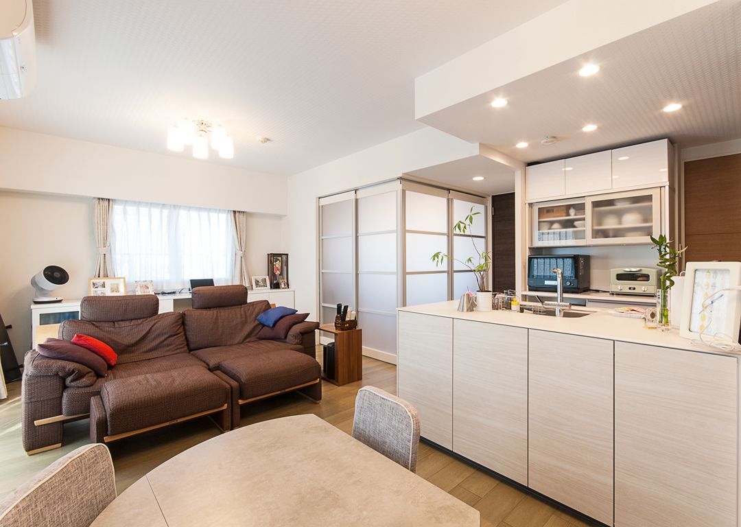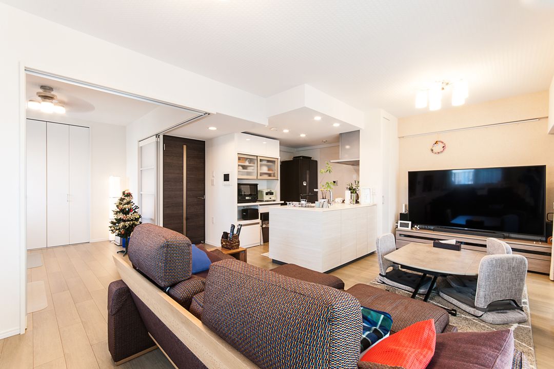 キッチンを対面オープンに、リビング隣の和室を洋室にし、間仕切り部分を全体的にスライドドアにしたことで、一体の広々としたLDKの印象となりました。