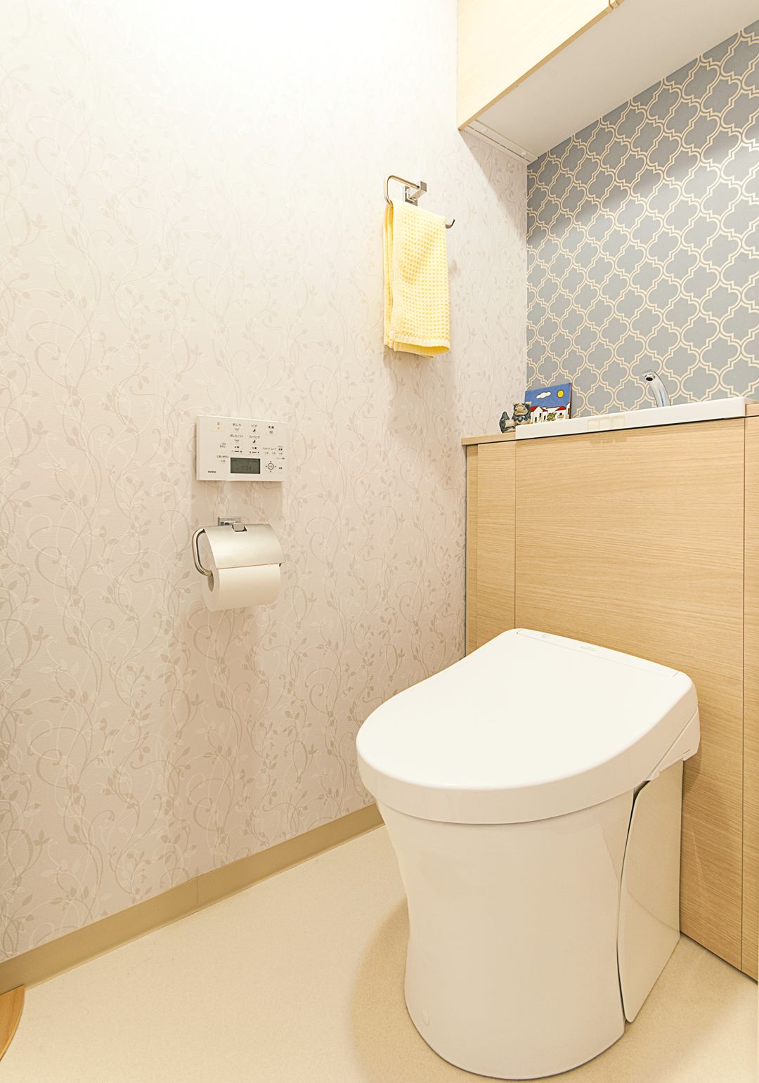 O様邸はどこを見ても壁面が素敵。白でまとめられたリビングは一見シンプルですが、よく見ると模様入りのクロスが組み合わせて貼られており優美さが窺えます。各お部屋は壁の一面にアクセントクロスが取り入れられ、トイレは植物モチーフのクロスにクラシカルな幾何学柄のアクセントクロスを配するなど、O様の豊かなセンスが感じられます。