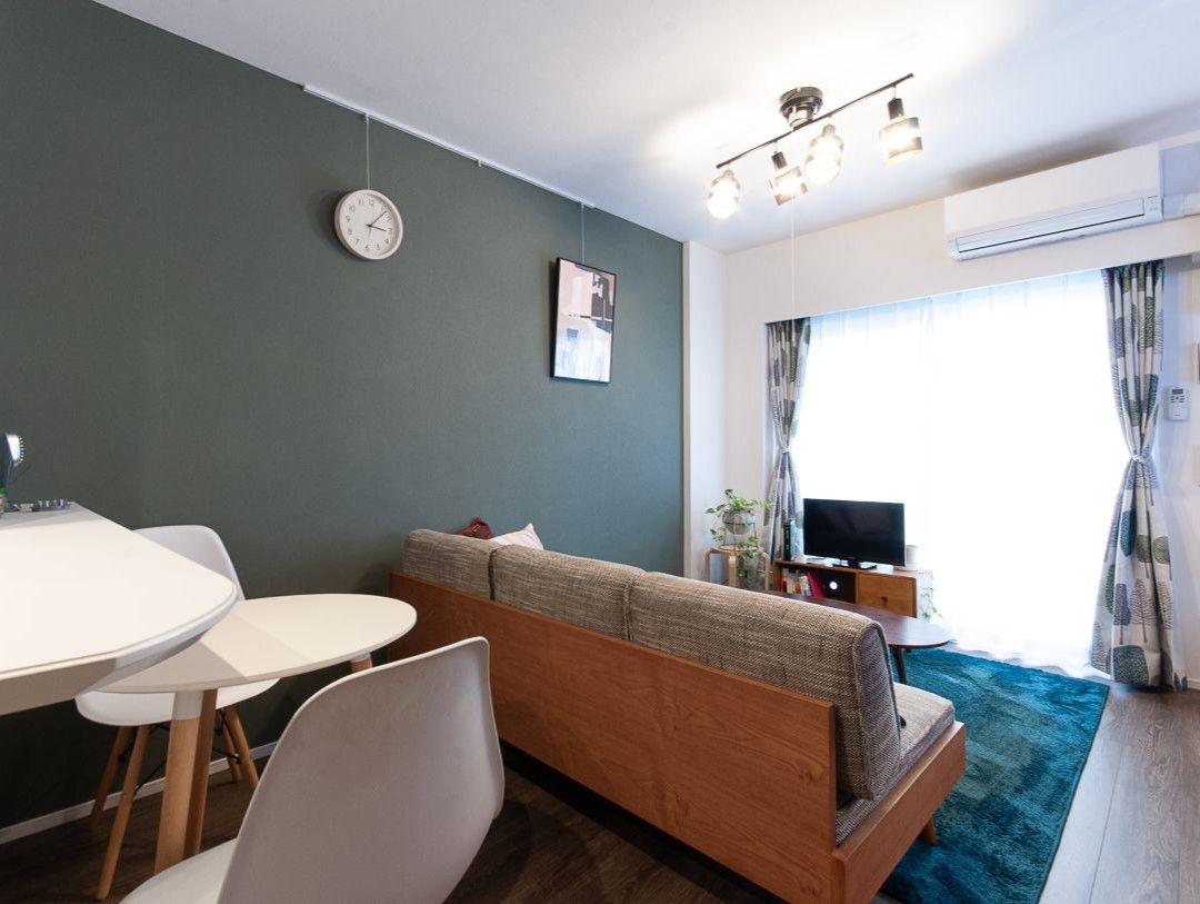 アクセントクロスは、 リビング・ベッド横の壁掛けラック部分・キッチン の3面に施工。当初は、色が濃く部屋が暗くなるのではと心配し、リビングとベッド横の2面だけにしたそうですが、施工後にご覧になった際、「このクロスがすごく気に入っちゃって、もっと増やせばよかった…」と、感じたそうです。