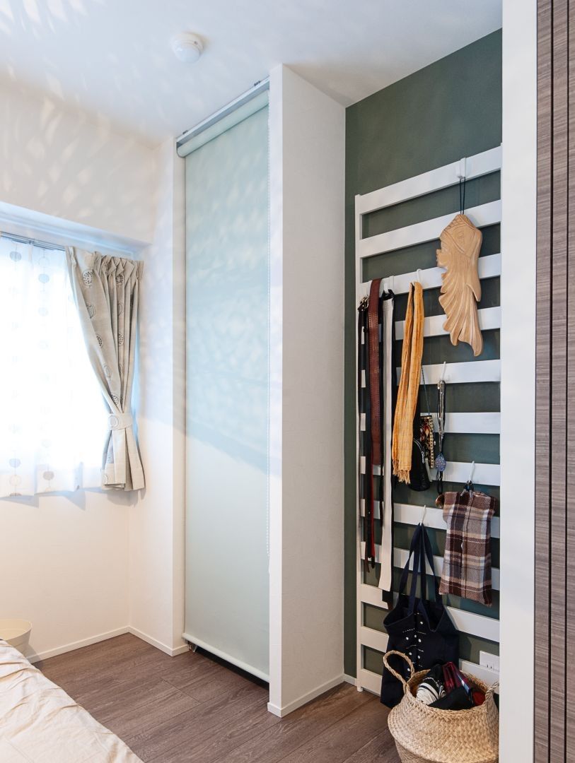 クローゼットの中のパイプを一方向からL字にしたことで、掛ける部分も上部棚も大幅に増え、バッグや寝具も問題なく収まるようになりました。また、動線を考えて扉をロールスクリーンに変更したことで、限られたスペースでも使いやすい収納が実現しました。